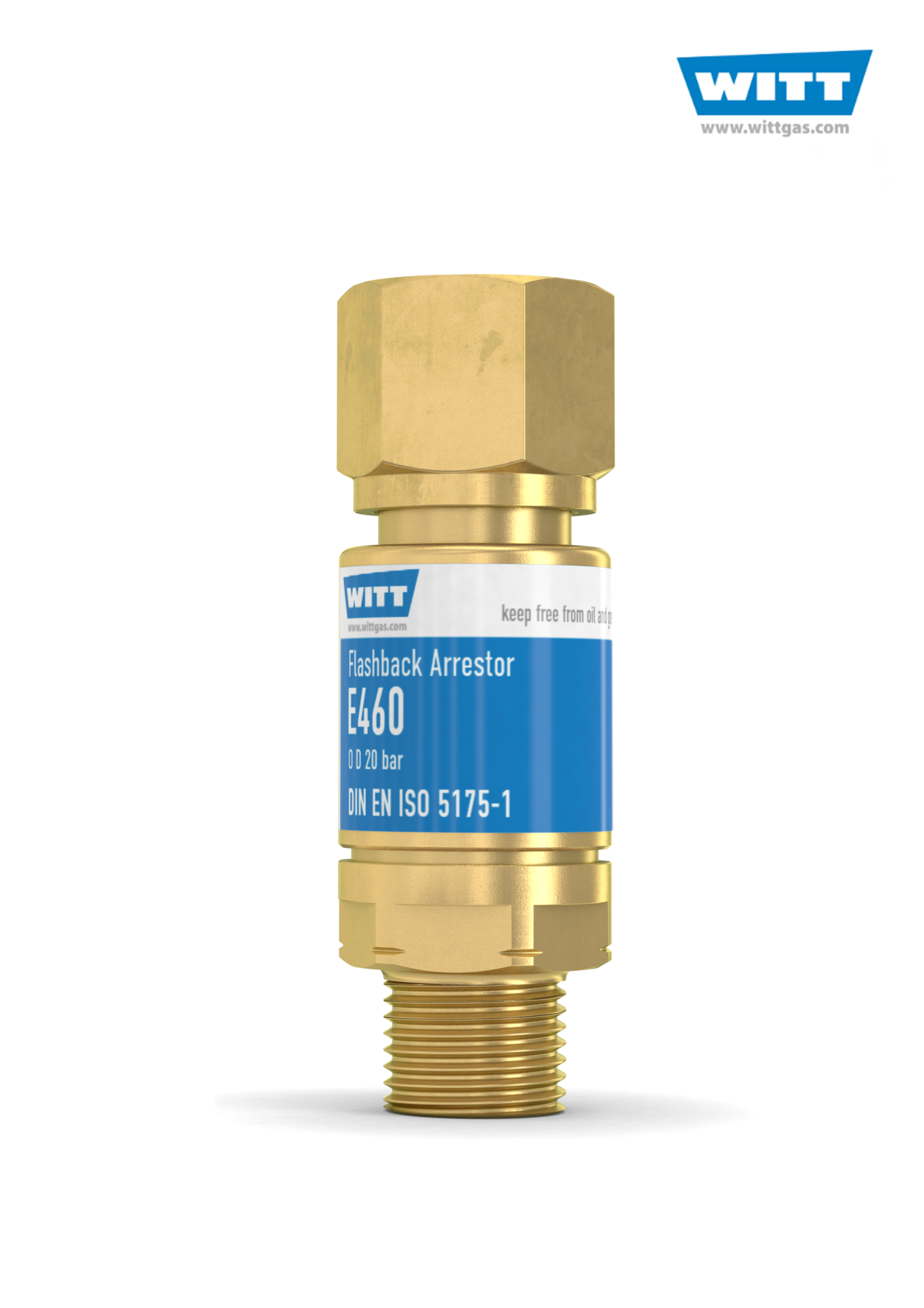 WITT Flashback Arrestors E460 for reliable protection against dangerous gas backflow and flashback in accordance with DIN EN ISO 5175-1. Every Arrestor 100% tested.